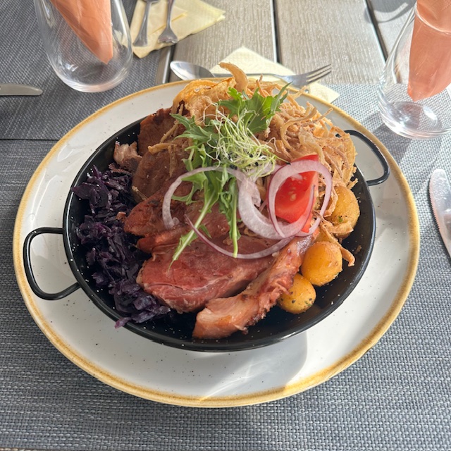 Sült csülök szeletek, sült füstölt-főtt csülök szeletek lyoni hagymával, pirított új burgonyával, párolt lila káposztával