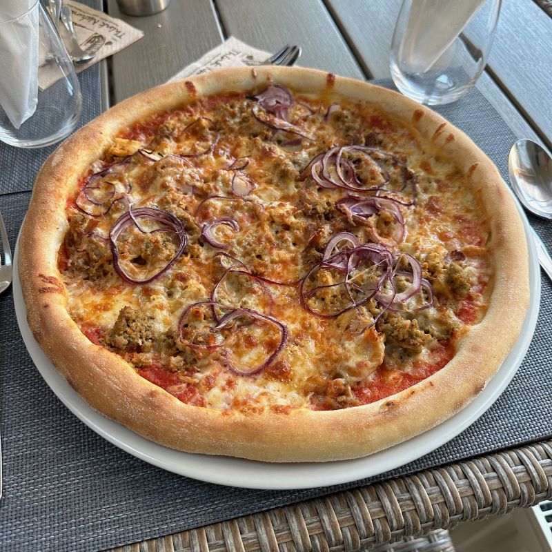 Paradicsomos alap, pirított marhahús, pirított csirke, tépett tarja, lilahagyma, mozzarella (1,4,7,9,10)