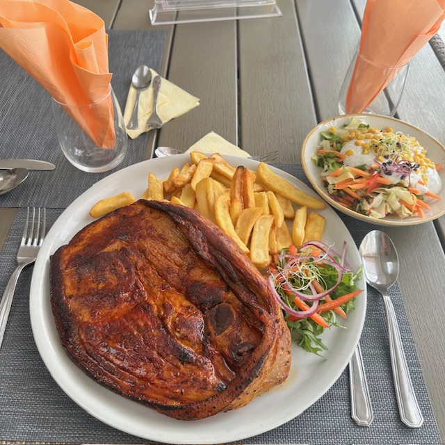 Magyaros pácban érlelt csontos-bőrös sertéscomb grillezve hasábburgonyával, salátával