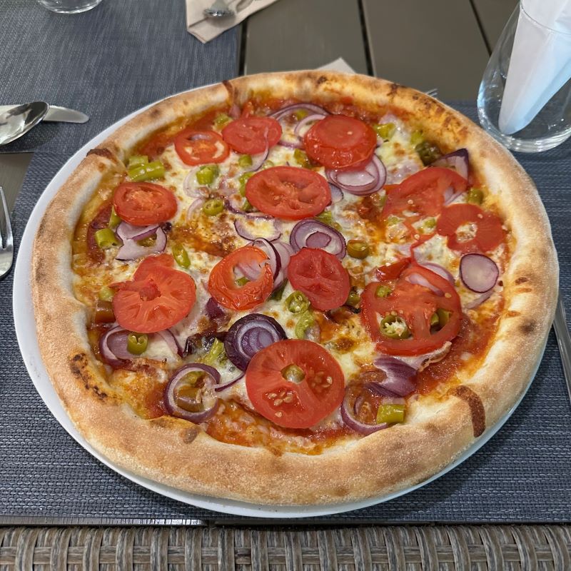 Paradicsomos alap, szalámi, bacon, lilahagyma, pepperóni, paradicsom, mozzarella (1,7)