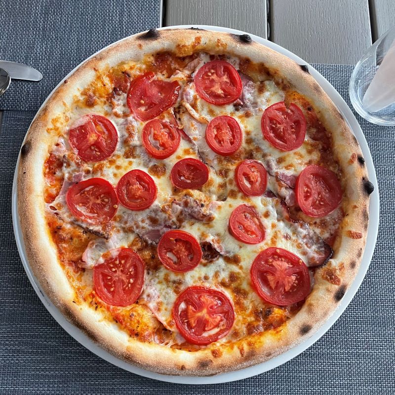 Paradicsomos alap, füstölt sonka, bacon, darált chili paprika, paradicsomkarika, mozzarella (1,7)