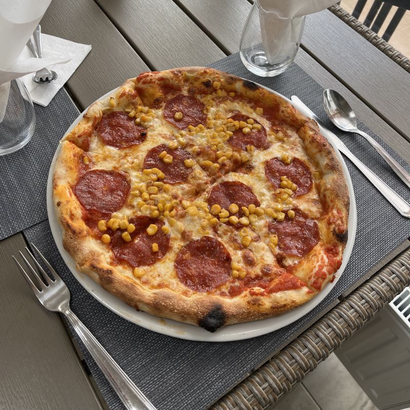 paradicsomos alap, paprikás szalámi, csemege kukorica, mozzarella (1,7,)