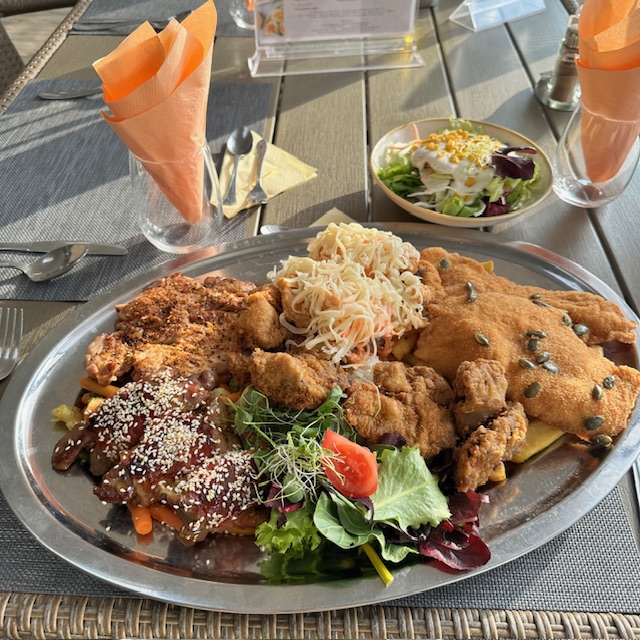 Rántott csirkemáj, grillezett csirkecombfilé, tökmagvas csirkemell, baconos kacsamell, pilisi csirkemell, jázminrizs, hasábburgonya, párolt zöldség, friss vágott saláta